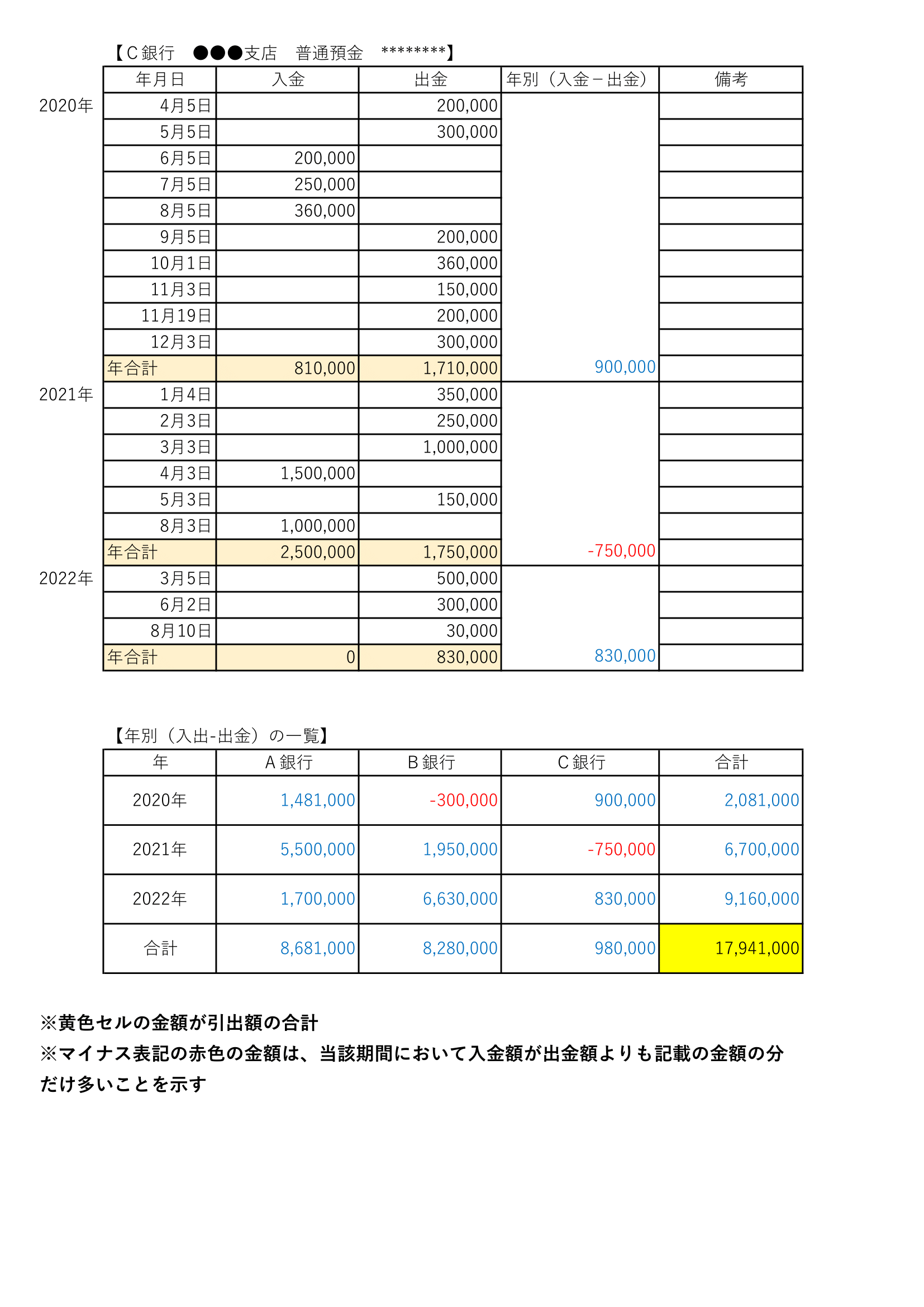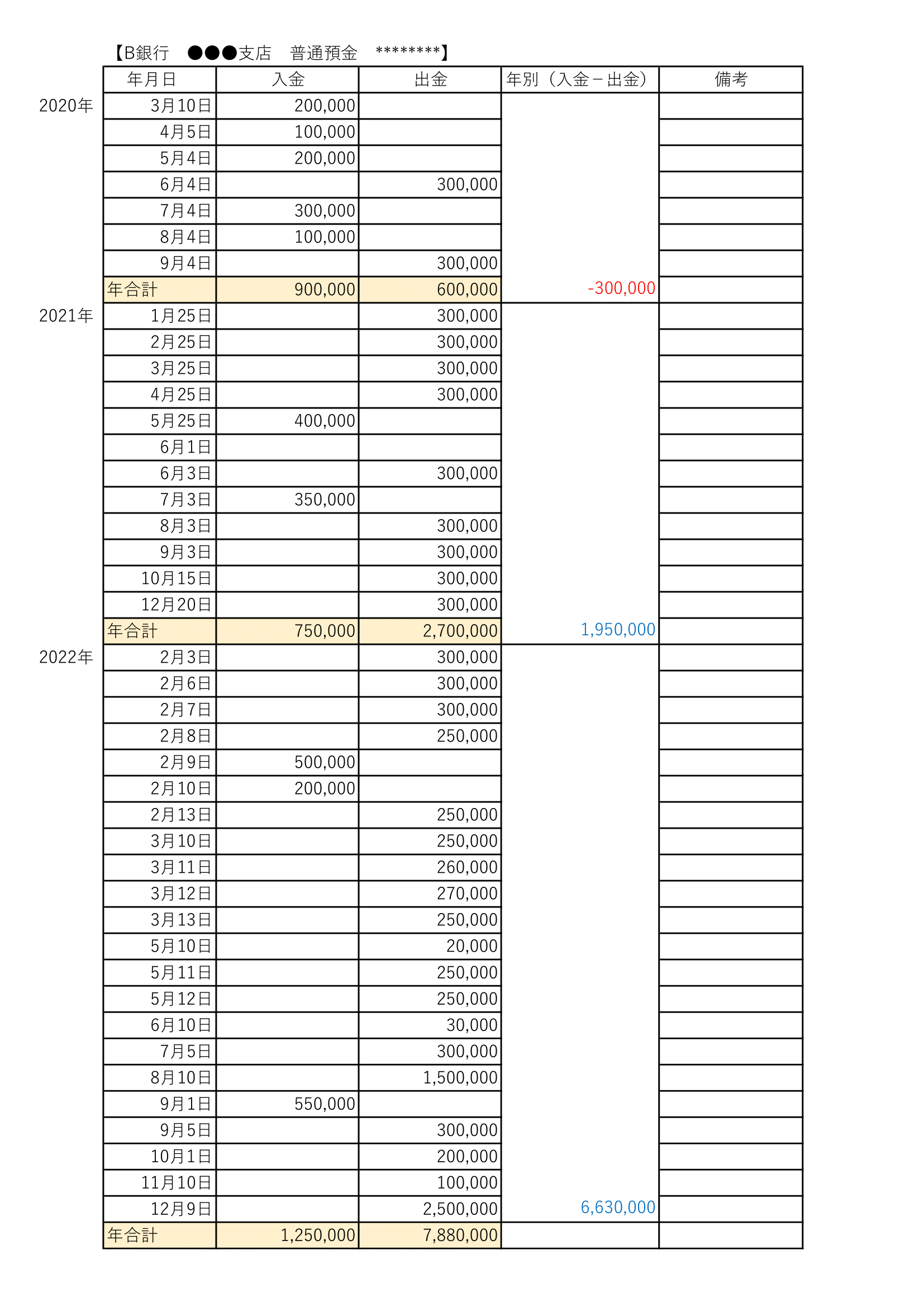 年度毎に入金と出金をまとめて行くと、どの時期にどのくらいの金額が引き出されたのかがわかります。