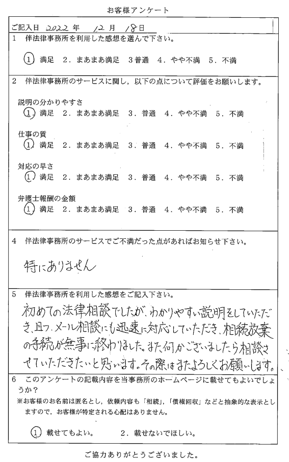 152 メール相談にも迅速に対応していただき、相続放棄の手続きが無事に終わりました。
