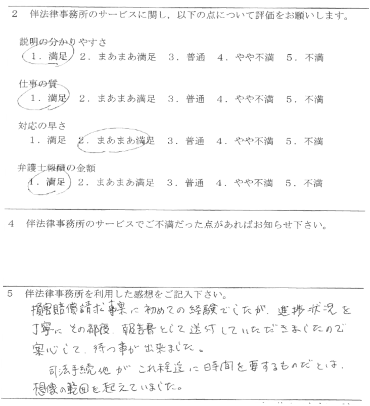 損害賠償請求事案に初めての経験でしたが、進捗状況を丁寧に