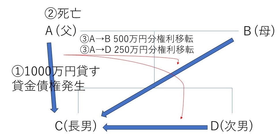この場合、Aが亡くなったとき、AはBに対し、1000万円の貸金債権を保有しているので、この貸金債権が法定相続分にしたがって、Bに500万円、Dに250万円ずつ承継されます(Cも250万円の貸金債権を取得しますが、自身が債務者なので250万円分は混同により消滅します)。この場合、Bは500万円、Dは250万円の返還請求権をCに対し取得します。