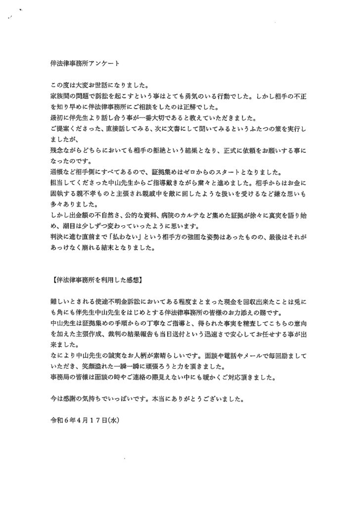 181 相手の不正を知り早めに伴法律事務所にご相談をしたのは正解でした
