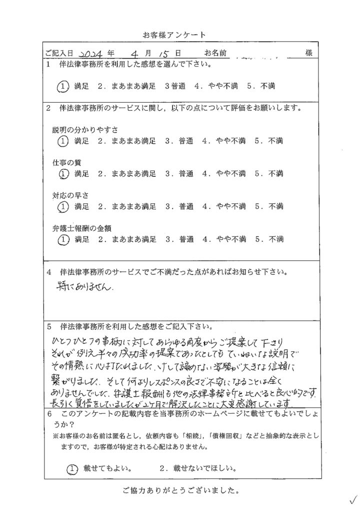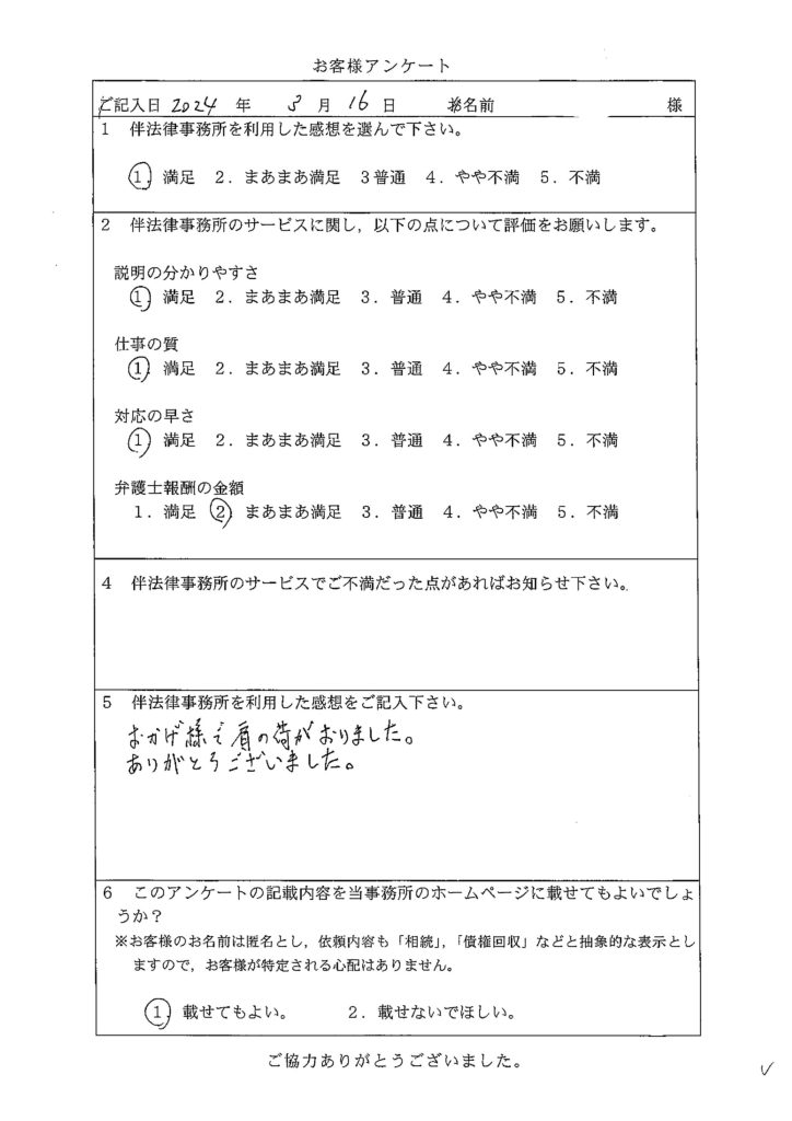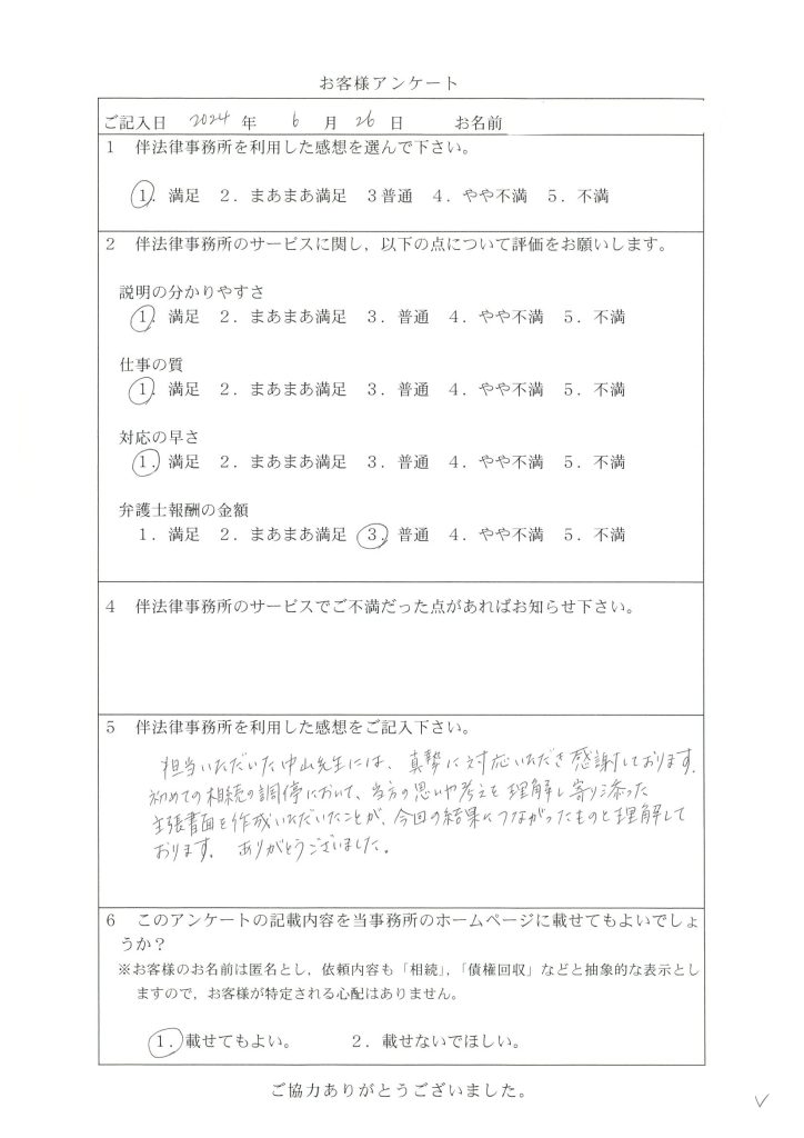 183 相続の調停において、思いや考えを理解し寄り添った主張書面を作成いただいたことが、今回の結果につながりました